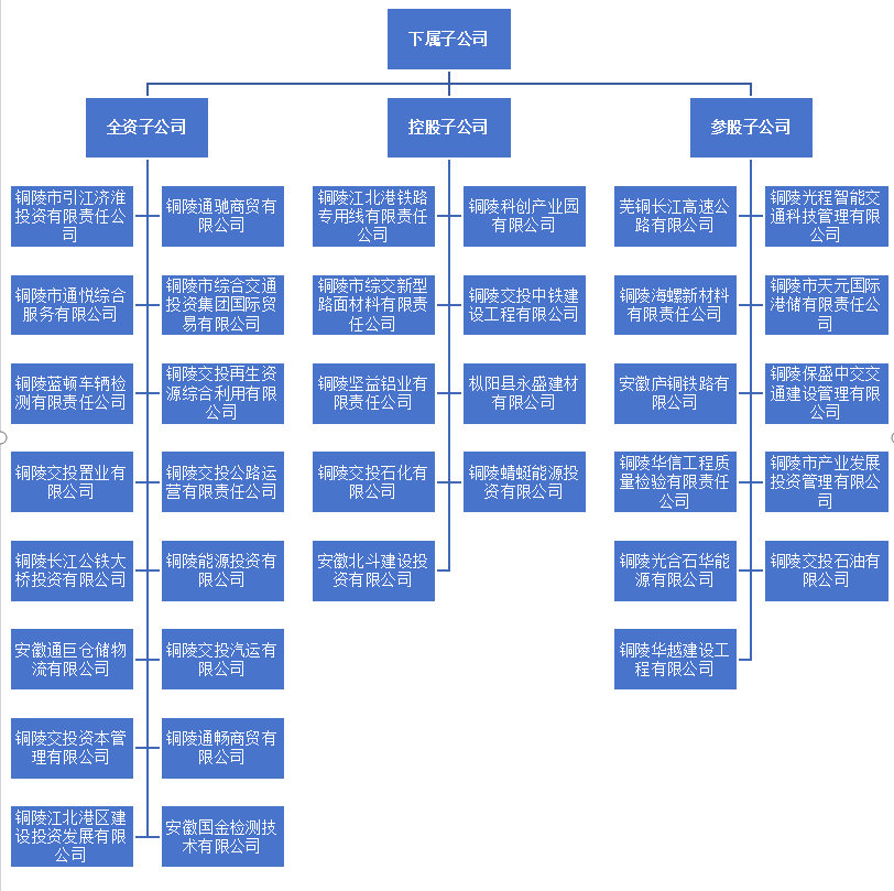 2017年8月18日,市委、市政府立足一江兩岸發展新局面,決定在原市交投公司整體劃轉新體基礎上組建集全市交通基礎設施項目投融資、開發建設和運營管理、參與項目謀劃工作為一體的綜合交通投資集團有限公司。注冊資本金109.77億元人民幣,企業主體信用評級“AA”等級,擁有全資子公司18家,控股公司10家,參股公司11家,是由銅陵市人民政府出資的市屬國有企業。
