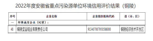 10月9日,市生態(tài)環(huán)境局對(duì)2022年度“安徽省重點(diǎn)污染源單位環(huán)境信用等級(jí)評(píng)價(jià)結(jié)果”予以公布,市交投集團(tuán)司屬堅(jiān)益鋁業(yè)公司經(jīng)過層層評(píng)選,成功榮獲“環(huán)保誠(chéng)信企業(yè)”稱號(hào)。據(jù)悉獲評(píng)該項(xiàng)榮譽(yù)我市共計(jì)92家企業(yè)。