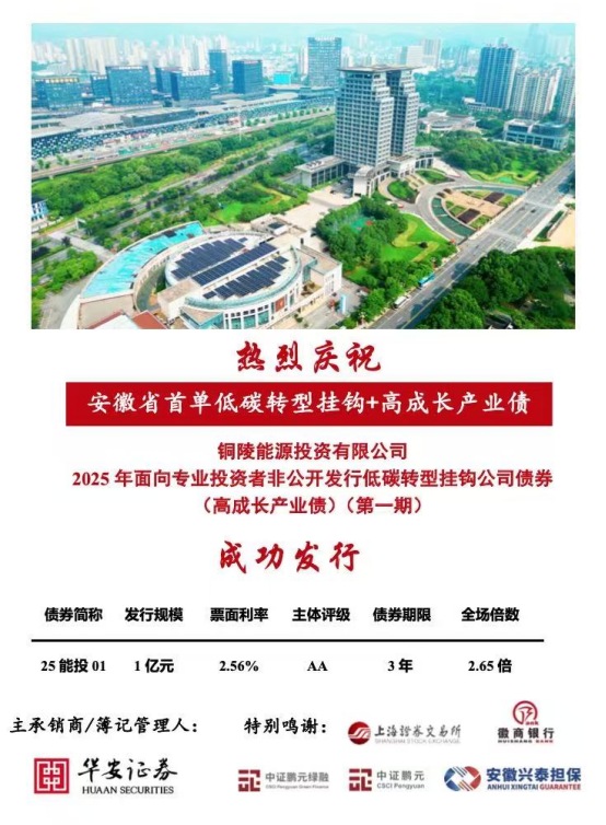 12月19日,銅陵市能源投資有限公司(以下簡稱“銅陵能投公司”)在上海證券交易所成功發行2025年第一期低碳轉型掛鉤公司債券“25能投01”。本次發行是安徽省首單低碳轉型掛鉤公司債+高成長產業債,也是銅陵能投公司在資本市場的首次亮相,額度3億元,本期發行1億元。期限3年,票面利率2.56%,全場認購倍數2.65倍。債券票面利率較1年期貸款市場報價利率3.0%下降44個基點,綜合節約融資成本約132萬元,標志著銅陵能投公司成功將金融創新、綠色發展以及產業轉型深度融合,獲得債券市場投資者的踴躍認購。