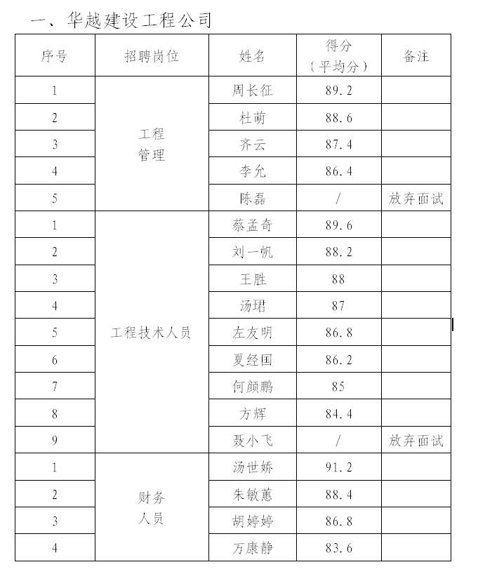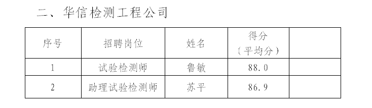 根據《銅陵華越建設工程有限公司公開招聘人員公告》、《銅陵市華信工程質量檢驗有限責任公司公開招聘人員公告》,于3月1日開展招聘人員面試工作,現將擬招錄人員公示如下: