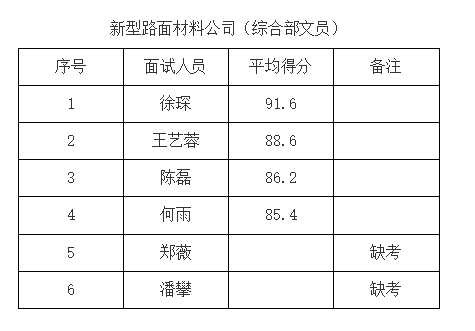 根據《銅陵市綜交新型路面材料有限責任公司公開招聘人員公告》,我公司已于2021年9月5日開展銅陵市綜交新型路面材料有限責任公司相關崗位面試工作,現將面試成績公示如下: